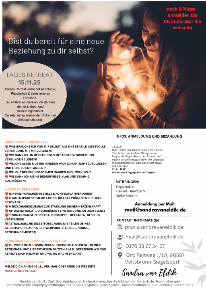 Formular bitte an mailATsandravaneldik.de schicken. Aktuell nur noch 3 freie Plätze!