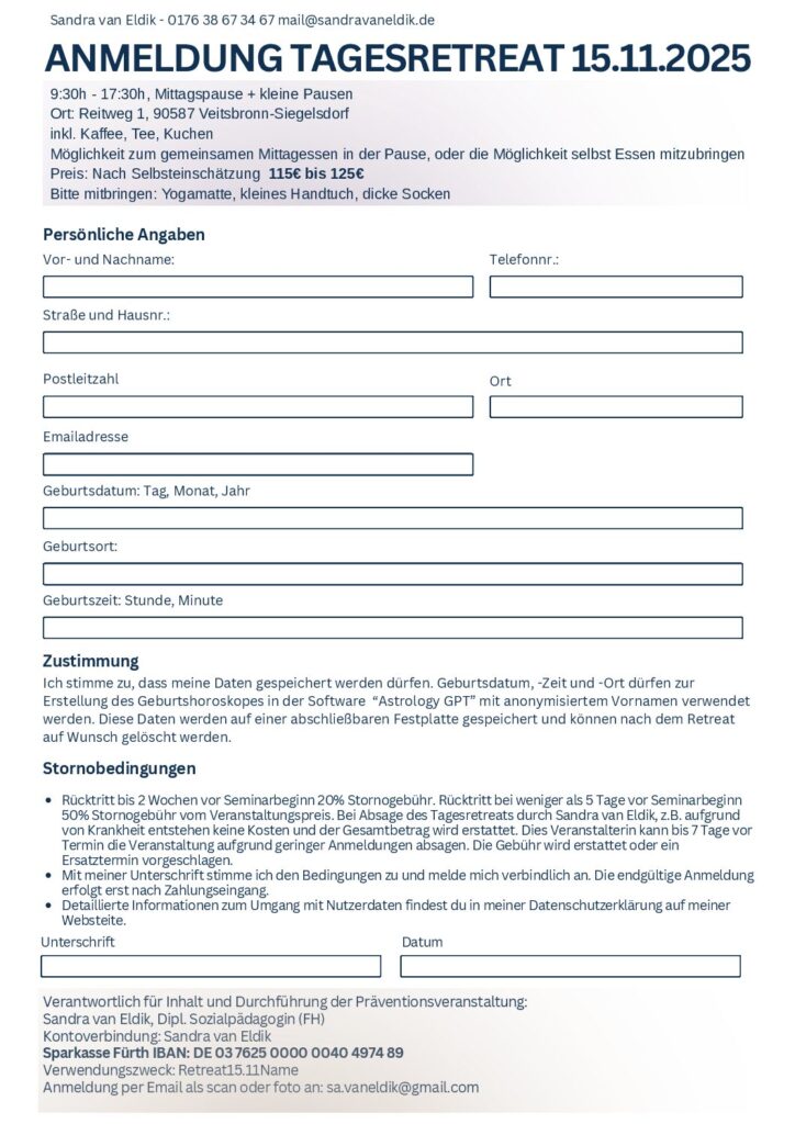 Formular bitte an mailATsandravaneldik.de schicken. Aktuell nur noch 3 freie Plätze!